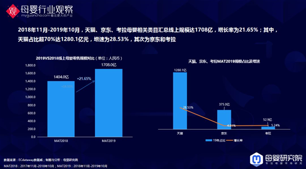 我們統(tǒng)計了天貓、京東、考拉等一些線上的主流平臺母嬰相關類目數(shù)據(jù),總規(guī)模達1708億,增長率約為21%,其中天貓占比最大,超過70%。