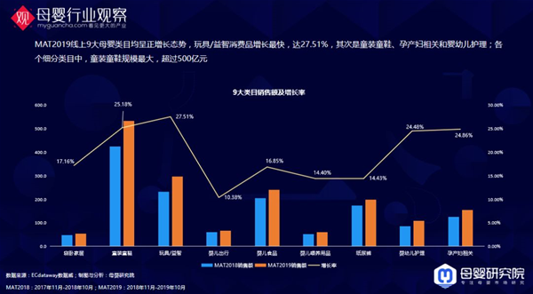 從產(chǎn)業(yè)的角度來看,我們將母嬰產(chǎn)品分為九大類目。增長最快的玩具/益智,達27.51%;其次是童裝童鞋、孕產(chǎn)婦相關和嬰幼兒護理;各個細分類目中,童裝童鞋規(guī)模最大,超過500億元。