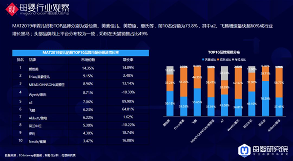 我們再看一下線上的排行,哪些品牌銷量是比較不錯的,2019年嬰兒奶粉TOP品牌分別為愛他美、美素佳兒、美贊臣、惠氏等。a2和飛鶴增長率超過60%。右邊是個品牌在不同平臺的銷售占比,京東、天貓平臺上奶粉的銷售占比差別不是很明顯,說明這些品牌還是有很強的品牌力,這些平臺不會對它們做過多的二選一的限制。