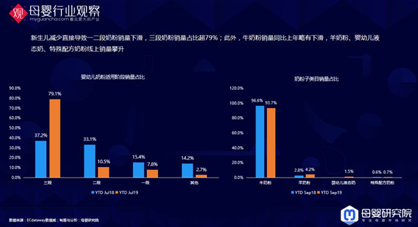 這一年,一段二段奶粉賣不動了嗎? 2019嬰兒食品同比上年增長率為16.85%;其中嬰兒奶粉銷售額超過150億,增長率為14.31%,零輔食、嬰幼兒營養(yǎng)品增長非常迅速,增長率超26%。 新生兒減少直接導致一二段奶粉銷量下滑,三段奶粉銷量占比超79%,另外很多企業(yè)都推出了四段奶粉,所以2020可能三四段奶粉是他們的主打產(chǎn)品;此外,牛奶粉銷量同比上年略有下滑,羊奶粉、嬰幼兒液態(tài)奶、特殊配方奶粉線上銷量攀升,增長還是很明顯的。