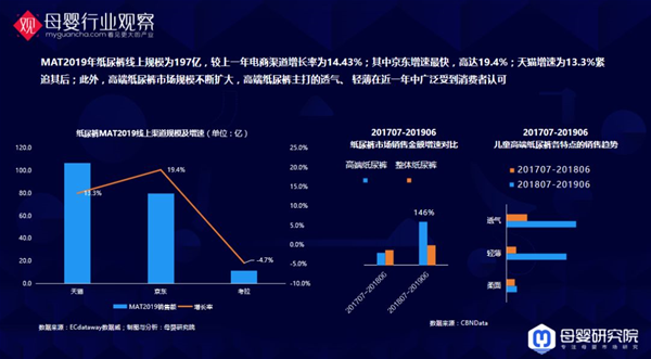 這一年,紙尿褲太“南”了。 我們知道有很多家紙尿褲企業(yè)其實已經(jīng)倒閉了,還是體量比較大的,2019年開始為前些年的冒進、泡沫買單。2019年紙尿褲線上規(guī)模為197億,較上一年電商渠道增長率為14.43%;其中京東增速最快,高達19.4%;天貓增速為13.3%緊追其后。 此外,高端紙尿褲市場規(guī)模不斷擴大,高端紙尿褲主打的透氣、 輕薄在近一年中廣泛受到消費者認可。