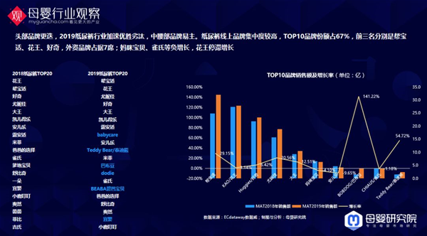 我們看頭部紙尿褲品牌格局,紙尿褲的榜單排名變化的非常大,2019年前三名分別是幫寶適、花王、好奇,外資品牌占據(jù)7席;媽咪寶貝、雀氏等負增長,花王停滯增長。