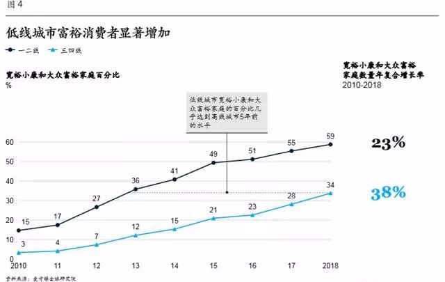 較富裕家庭占到三四線城市人口的34%以上 盡管人們普遍更關注北京和上海等大城市的新一代富裕消費者,但中低線城市“年輕購物達人”的出現(xiàn),凸顯出中小城市消費者的重要性。最近幾年,在知名度不高的三四線城市(如,綿陽、鹽城和自貢等),中上層中產(chǎn)階級消費者數(shù)量快速增長。 2010年至2018年,三四線城市中,年可支配收入達到14萬至30萬元人民幣的家庭年復合增長率達到38%,高于一二線城市的23%。這些較富裕家庭(我們稱之為“寬裕小康”和“大眾富裕”階層)占到三四線城市人口的34%以上,接近高線城市5年前的水平(圖4)。