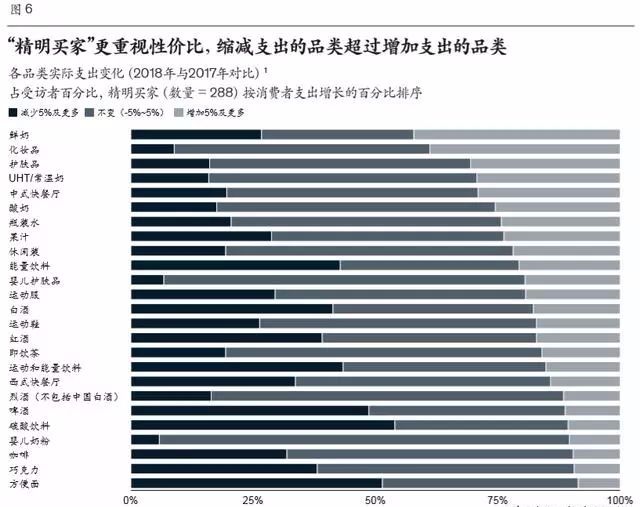 精明買家:這一群體也青睞更高品質(zhì)的產(chǎn)品,但由于其收入略低于“品味中產(chǎn)”和“購物達人”,因此,他們時刻追求最高的性價比,既要品質(zhì)過關,又要價格合理。事實上,他們減少支出的品類已經(jīng)超過了增加支出的品類(圖6)。 精明買家生活穩(wěn)定,所以無論是經(jīng)濟上還是個人生活上,都有大把時間和足夠動力去仔細評估不同產(chǎn)品,找到物美價廉、經(jīng)久耐用的商品。如果給這類消費群體畫像的話,她們往往是已婚、中年、女性、生活在成本較高的一線城市。他們僅為2018年消費支出增長貢獻了6%。