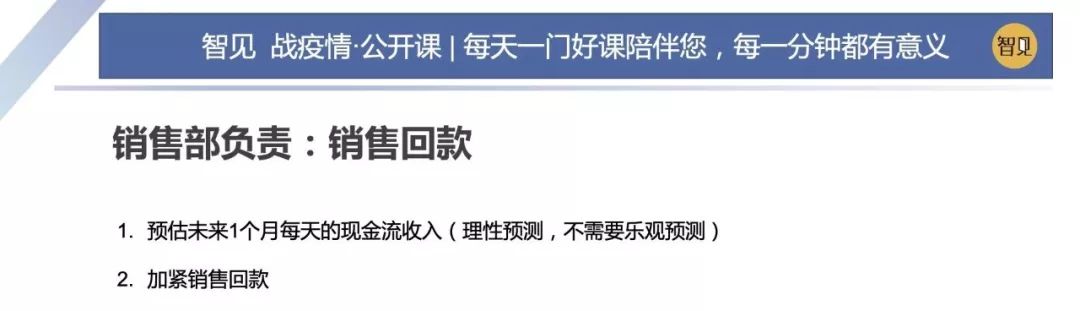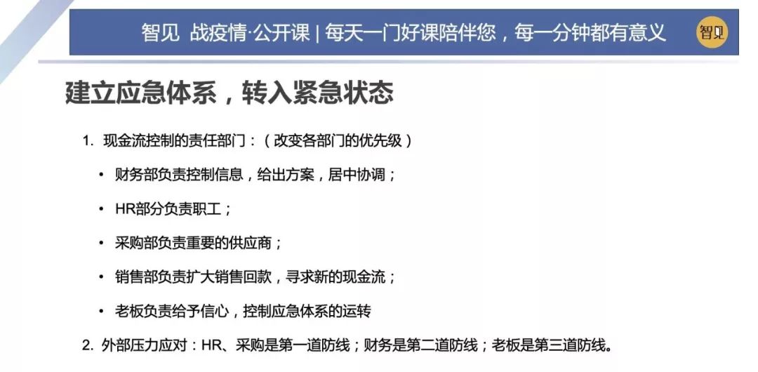因為這場突如其來的疫情,這兩天西貝集團董事長賈國龍在接受采訪時說,西貝的現金流最多能撐 3 個月。老鄉雞董事長束從軒、九毛九集團董事長管毅宏等一些餐飲業大佬也表示,他們的餐飲企業現金流最多能撐 1 個半月。恒大研究院院長任澤平指出,受疫情影響,餐飲、旅游、電影、交運、教育培訓等行業沖擊最大,僅春節 7 天時間簡單估算的損失,電影票房 70 億(市場預測)+餐飲零售 5000 億(假設腰斬)+旅游市場 5000 億(完全凍結),這三個行業直接經濟損失已經超過 1 萬億。 這幾天國內眾多的投資機構的負責人,也紛紛給自己的被投企業打電話,詢問企業的現金流如何?可見,疫情對于企業經營的影響是非常直接而深遠的。 面對疫情,現金流無疑是企業生存之本。本期「智見 戰疫情·公開課」請到了智見財稅合伙人傅旭東老師為大家帶來分享:應急狀態下的現金流管理 緊急狀態下的現金流管理 面對疫情,現金流無疑是企業生存之本。本期「智見 戰疫情·公開課」請到了智見財稅合伙人傅旭東老師為大家帶來分享:應急狀態下的現金流管理 「傅旭東:上海稅務師事務所合伙人,注冊會計師、注冊稅務師,22年財稅工作經歷,是上海市政府特聘服務企業的財稅專家,長期擔任上市公司風控管理人」 今年疫情對絕大多數的企業都產生了重大的影響,我們企業家要想辦法自救,活下來,轉危為機。企業活下來,最核心條件是現金流。
