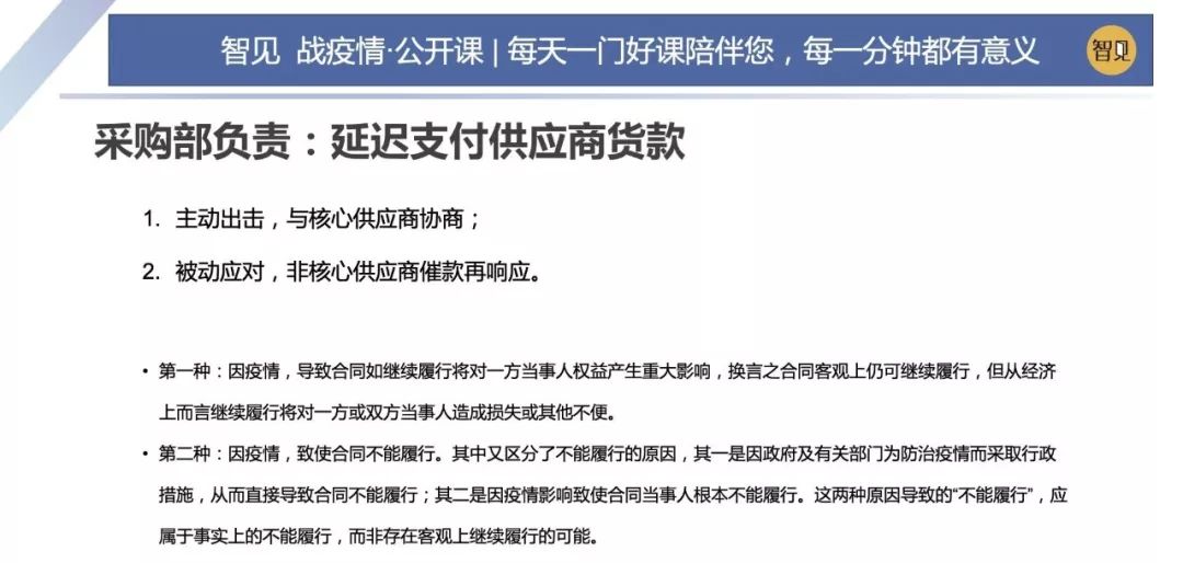 采購部的主要任務就是要跟所有的供應商談判,然后延遲支付供應商的貨款。對主要的供應商,我們要進行主動出擊。何為主要供應商?如果供應商不發,或者不支持我們的話,生產經營就可以可能中斷。這叫做主要供應商。 在這次疫情情況下,建議要早一點跟供應商進行協商,協商越早越可能獲得更大的延期支付空間。 我們一般與供應商都是共生關系,溝通成功的可能性還是很高的。為了保證采購部的成功率,財務總監可以一起向客戶作出一些承諾和保證。法律上有一些信息,可以給到采購部門做參考。 商業合同約定中,有一條叫不可抗力條款。條款中包括戰爭、地震、海嘯等,但恰恰疫情是不包括在內的。但是2003年非典疫情期間,針對疫情產生的民事糾紛,最高法院曾經出過一個指導意見。 第一種規定:因疫情導致合同繼續履行給當事人的一方權益產生重大影響的。換言之,就是合同客觀上可以繼續履行,但是繼續履行的話,會給一方當事人造成重大損失或者不便的。第二種就是因疫情導致合同不能履行的,這里面又區分為兩種原因,一種是政府規定,采取的行政措施,導致合同直接不能履行的;第二個是因為疫情的影響導致當事人不能履行的,這兩種情況都叫做無法繼續履行。 上述兩種情況是很好用的一個工具。具體如何運用這兩個條款,行業上有一些分析,餐飲、娛樂、金融服務、工廠、普通企業辦公等人流密集性的場所,因為疫情的原因導致損失的,都有可能會引用上述的兩個條款。 關于采購部門跟財務部門如何配合共同說服供應商延遲支付貨款,我們在2018年的案子中做了一些經典配合。 正常情況下,一般是采購部門先去溝通,如果溝通不下來,會邀請供應商到達公司,財務部門會出面大家一起跟跟供應商開會,說服他們。在極端情況下,財務有一個工具可以使用,就叫做期票。 期票,就是普通的轉賬支票,只是開具的日期是遞延30天以后。這樣供應商拿著支票回去,他也有一個交代,同時也獲得相應的一個保證。 期票本身并不完全合規,但是在現實中可以這樣去使用。期票開出以后要特別小心,因為它是未來一段時間才到銀行去兌付的。財務部門要把這個期票的信息要錄入到現金流預測表里面。防止出現空頭支票,這樣問題就比較嚴重了。 接下來討論如何延遲支付員工工資