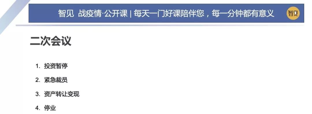 首先,投資暫停 要停止擴張計劃,停止所有需要花錢的項目。我們當時定了一個原則,就是合作方愿意延遲三個月的項目,可以進行保留;能立即產生現金流的項目可以進行保留。 投資暫停往往是一個非常痛苦的決定,因為很多項目初期已經有成本投下去了,這時候暫停投資的話會有重大的損失。金總當時經準備擴張幾家店,所有的押金已經支付完畢,甚至有的已經裝修完畢,這些項目停止給公司帶來的損失是非常巨大的,但是它帶來的好處就是及時的終止了現金流的損失。 第二,緊急裁員 危機對企業有利一面,是可以清理一些不重要的人員,壓縮一下各部門的成本支出。在危機的情況下,這樣大家都比較容易理解,更容易貫徹執行下去。 第三,資產進行轉讓變現 資產轉讓變現上,老板執行決策、執行要快。老板要降低預期值,這樣便于快速成交,回籠資金。我覺得我們可以從王健林為解決他的現金流危機時所做的方法中去借鑒一些經驗。 2018年我們為金總處理過他的一些投資和門店,有些門店快速地轉讓給核心員工,有些快速轉讓給一些同行,實現了資產的快速變現。同時也實現了一些非優質資產的一個剝離。 第四,停業 公司在極端情況下是可以考慮停業的,這個決策的話特別適合低端的勞動密集型企業,這樣可以極大地節約人力成本。