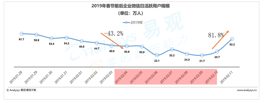 根據(jù)易觀千帆數(shù)據(jù)顯示,2019年春節(jié)前一周釘釘平均日活躍用戶為1999.8萬人,而春節(jié)假期期間平均日活躍用戶為872.3萬人,降幅達到56.4%,而節(jié)后第一天日活躍用戶猛升至2258.6萬人,較假期平均值增幅達到105.9%。同樣春節(jié)前一周企業(yè)微信平均日活躍用戶為51.7萬人,而春節(jié)假期期間平均日活躍用戶為32.2萬人,降幅達到43.2%,而節(jié)后第一天日活躍用戶猛升至52.2萬人,較假期平均值增幅達到81.8%。 在2019年的春節(jié)假期中,釘釘及企業(yè)微信出現(xiàn)了明顯的曲線變化,休假復(fù)工現(xiàn)象明顯。