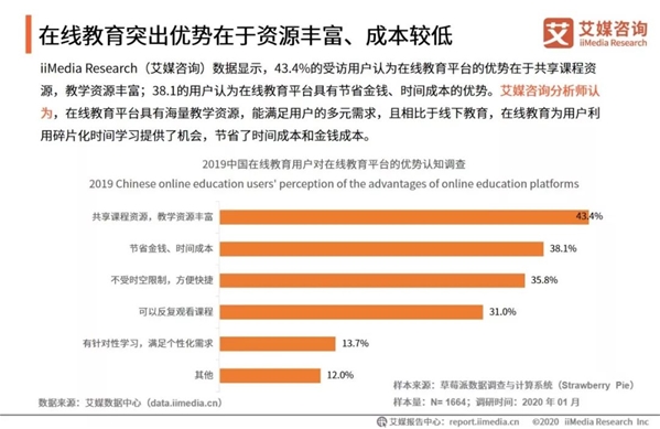 隨著大量學習需求涌入線上平臺,用戶規模短期內激增,在線教育行業將迎來重大發展。而傳統線下教育機構在此次突發性公共衛生事件的影響下,正面臨著線下全面停課的巨大沖擊。同時,傳統教育機構不得不以線上課程轉型的方式來應對此次疫情帶來的影響,但其由于缺乏經驗和技術,面臨挑戰較大,尤其是中小企業,或較難度過疫情寒冬。 用戶需求趨于嚴苛,在線教育開啟精細化運營時代 線上課程突破時空限制,節省時間和金錢成本。跟誰學、猿輔導等機構的大班課模式覆蓋人群數量可觀,但存在體驗性、互動性較弱的問題;掌門教育等機構的1對1模式能夠提供個性化教學和接近于線下的互動感,但對網絡并發的穩定性要求高。 隨著認知的增強,如今的在線教育用戶對產品的要求正在逐漸變得嚴苛,在線教育企業應該強化自身精細化運營策略,以用戶需求為核心,注重全面提升自身實力,保證課程質量,優化用戶體驗。 iiMediaResearch(艾媒咨詢)數據顯示,43.4%的受訪用戶認為在線教育平臺的優勢在于共享課程資源,教學資源豐富;但同時,用戶對師資質量、課程質量依舊存在顧慮,偏好選擇知名的在線教育品牌。艾媒咨詢分析師認為,在線教育平臺具有海量教學資源,能滿足用戶的多元需求,但在提供海量教育資源的同時,更應嚴格把控教師質量、提高課程質量、完善用戶保障體系。