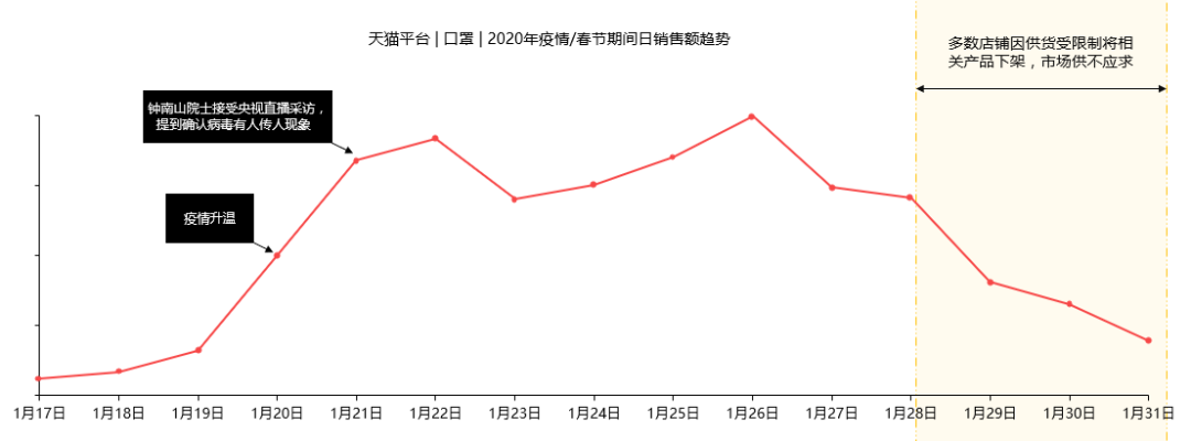 研究平臺(tái):天貓。研究時(shí)間:2020年除夕當(dāng)周(2020.1.24-1.30)與前一周(2020.1.17-1.23)的環(huán)比變化,對(duì)比2019年除夕兩周變化。疫情升溫日期以2020年1月20日作為起算之日。(數(shù)據(jù)統(tǒng)計(jì)日期截止到1月31日) 隨著疫情升溫,在疫情就是命令的嚴(yán)峻情況下,今年的春節(jié)很不一樣。消費(fèi)者心理預(yù)期產(chǎn)生變化,具體在消費(fèi)行為有了哪些轉(zhuǎn)變?且看數(shù)據(jù)威對(duì)比春節(jié)近兩周銷售趨勢(shì)的觀察。 抗疫防護(hù)產(chǎn)品 以口罩、護(hù)目鏡、防護(hù)服為代表的自我防護(hù)類目,銷售額爆量增長(zhǎng),抗疫期間一罩難求的困境也是目前供需市場(chǎng)里面最迫切待解的問(wèn)題。
