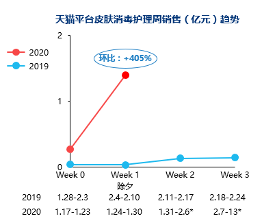 進(jìn)一步觀察分周銷售表現(xiàn),可看到在疫情升溫后,消費(fèi)者對(duì)于皮膚消毒護(hù)理產(chǎn)品(75%酒精噴霧劑、消毒液)需求提高,相似于防疫產(chǎn)品的供不應(yīng)求現(xiàn)象,消毒相關(guān)產(chǎn)品未來(lái)幾周的銷售趨勢(shì)仍待觀察。