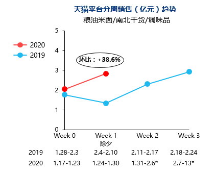進(jìn)一步觀察多數(shù)細(xì)分子行業(yè)短期內(nèi)無(wú)明顯變化,僅食品行業(yè)下糧油米面/南北干貨/調(diào)味品下如方便速食(如:方便面、方便粉絲、即食火鍋、面條/掛面)、米/面粉(如:大米、面粉)帶動(dòng),此類產(chǎn)品本身具備方便性且可耐儲(chǔ)存,原本在春節(jié)期間銷售持平,此次或受疫情聯(lián)動(dòng)使得品類有明顯反彈。