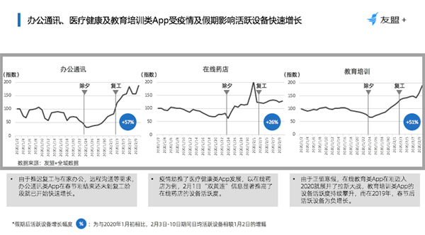 由于推遲復工與在家辦公,遠程溝通等需求,辦公通訊類App在春節剛結束還未到復工階段就增長明顯。疫情助推了醫療健康類App發展,以在線藥店為例,2月1日“雙黃連”信息顯著推高了在線藥店的設備活躍度。同時由于正值寒假,在線教育類App在剛邁入2020就展開了拉新大戰,教育培訓類App的設備活躍度持續攀升,而在2019年,春節后活躍設備為負增長。 生活類App,如母嬰、運動健身及其他生活服務類在春節期間呈V字型發展,節后恢復