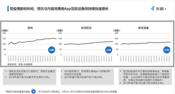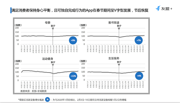冬末春至,新年伊始,在全國人民齊心協力“抗疫”的這場特殊戰役中,全民需求往線上轉移,移動互聯網新拐點產生。友盟+分析了整個大盤的13個重點行業,讓大家更客觀的了解今年春節以及疫情給行業帶來的影響和變化,同時也期望行業的每一位參與者能借此機會養精蓄銳,為明天做好準備。 幾大關鍵發現 1、移動互聯網設備活躍度穩步提升,但由于季節性因素新增設備量減少; 2、受疫情影響,休閑、資訊與內容消費類App活躍設備與新增設備量均保持持續增長;母嬰、社交、游戲短期內將保持增長; 3、疫情加速移動辦公、醫療健康、以及教育培訓快速增長;推動相關領域資源向下線城市滲透,用戶使用時長提升; 4、內容消費類,在春節期間保持了穩定的活躍度,用戶使用時長也穩步提升; 5、重線下服務的行業,如旅游出行與汽車行業受重創,短期內無復蘇跡象; 6、生鮮電商幫助電商行業減輕了疫情的沖擊;但其表現受快遞物流能力抑制減弱; 7、疫期快速發展的線上藥店、教育培訓、母嬰、游戲,14日留存率表現相對較差; 8、武漢地區的移動互聯網應用顯著變化,緩解疫情帶來的緊張氛圍與情緒類的 App新增比例顯著高于全國水平。 綜合來看,今年這個特殊的春節相較于去年,整個行業變化如下圖。其中游戲行業增幅15%,是2019年的2倍;影視增幅8%,是去年的3倍左右;辦公通訊上漲明顯,增幅150%,網上藥店活躍設備增幅由負轉正,增幅61%;旅游與汽車的降幅是去年的3-4倍,分別下跌55%及29%。