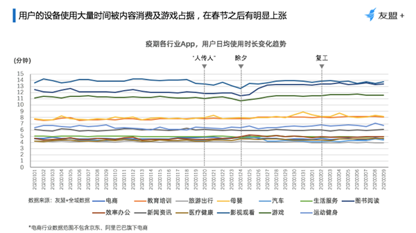 另外,全民宅家,移動互聯網使用時長被強制拉長了。從App使用時長來看,用戶的設備使用大量時間仍被影視觀看、圖書閱讀及游戲占據,其次受疫情延期開學影響,母嬰及教育培訓類應用使用時長排名較高,再次是運動健身、新聞資訊類。旅游出行、健康及電商類使用表現低迷。