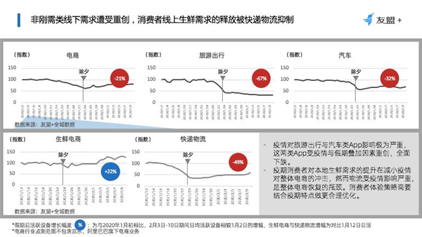 母嬰與圖書閱讀行業平穩中略有增長;疫情總體對運動類影響一般,春節后呈V字型恢復,戶外運動類相對受影響更多;生活服務總體平穩,其中寵物資訊類App一直保持相對穩定的活躍度;本地生活、美食菜譜類App活躍度有所提升;線下服務類的App活躍度受疫情影響更多。 非剛需類線下需求遭受重創,消費者線上生鮮需求的釋放被快遞物流抑制