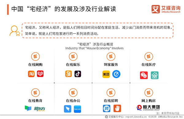 2019年,21.3%宅家網(wǎng)民線上消費(fèi)占總消費(fèi)的比例在61%以上,宅家網(wǎng)民對線上消費(fèi)依賴程度較高;77.1%宅家網(wǎng)民主要通過線上渠道進(jìn)行娛樂,其中最受歡迎的是影視音樂,占比48.2%。在2020年新春新冠狀病毒疫情影響下,居民防疫隔離增加了宅在家里的時(shí)間,線上消費(fèi)、線上娛樂需求增加,使得“宅經(jīng)濟(jì)”成為當(dāng)前重要的經(jīng)濟(jì)發(fā)展模式。 《2020年中國疫情影響下的“宅經(jīng)濟(jì)”發(fā)展及投資邏輯分析報(bào)告》主要從2020年疫情對行業(yè)經(jīng)濟(jì)的影響及發(fā)展前景進(jìn)行分析,特別關(guān)注到行業(yè)的投資邏輯,對快遞行業(yè)、在線娛樂、生鮮電商、在線教育、在線醫(yī)療、在線辦公等進(jìn)行行業(yè)案例分析,對行業(yè)總體發(fā)展趨勢進(jìn)行解讀并深入研究其商業(yè)運(yùn)作模式,預(yù)測2021年中國各主要產(chǎn)業(yè)的發(fā)展趨勢和運(yùn)營模式。 報(bào)告核心觀點(diǎn) 中國“宅經(jīng)濟(jì)”模式已經(jīng)基本形成,成為重要發(fā)展模式 數(shù)據(jù)顯示,2019年,21.3%宅家網(wǎng)民線上消費(fèi)占總消費(fèi)的比例在61%以上,宅家網(wǎng)民對線上消費(fèi)依賴程度較高;77.1%宅家網(wǎng)民主要通過線上渠道進(jìn)行娛樂,其中最受歡迎的是影視音樂,占比48.2%。 艾媒咨詢分析師認(rèn)為,中國“宅經(jīng)濟(jì)”業(yè)態(tài)早已形成,但在2020年新春新型冠狀病毒疫情影響下,居民防疫隔離增加了宅在家里的時(shí)間,線上消費(fèi)、線上娛樂需求增加,使得“宅經(jīng)濟(jì)”成為當(dāng)前重要的經(jīng)濟(jì)發(fā)展模式。 新冠疫情擴(kuò)大“宅經(jīng)濟(jì)”的應(yīng)用場景,利好相關(guān)行業(yè) 新冠肺炎疫情對于國內(nèi)不同行業(yè)將產(chǎn)生不同影響。2019年春節(jié)黃金周期間,全國零售和餐飲企業(yè)實(shí)現(xiàn)銷售額超過1萬億元。受疫情影響,2020年春節(jié)消費(fèi)大幅度減少。其中,餐飲、酒店、旅游、影院、交通等行業(yè)首當(dāng)其沖,有關(guān)企業(yè)收入出現(xiàn)斷崖式下跌。 但是,受到交通管制和隔離影響,在線購物、在線娛樂、生鮮電商、在線醫(yī)療、在線教育、在線辦公等經(jīng)濟(jì)業(yè)態(tài)相對活躍,可以部分抵消疫情對經(jīng)濟(jì)的不利影響。 新冠疫情對國民經(jīng)濟(jì)影響程度低于非典時(shí)期,多種商業(yè)運(yùn)營新模式有待探索 與“非典”時(shí)期相比,當(dāng)前的增長環(huán)境、產(chǎn)業(yè)結(jié)構(gòu)與政策刺激空間都已發(fā)生變化,對緩解及應(yīng)對沖擊都相對不利。但新冠肺炎疫情產(chǎn)生的沖擊必定是短暫的,疫情結(jié)束后經(jīng)濟(jì)增長將很快回到正常發(fā)展軌道。 疫情倒逼線上經(jīng)濟(jì)發(fā)展,同時(shí)催生的諸如無人配送、共享員工之類的新運(yùn)營模式,未來隨著互聯(lián)網(wǎng)技術(shù)持續(xù)改進(jìn)升級,更多經(jīng)濟(jì)新形式、新業(yè)態(tài)將更具探索空間。 行業(yè)背景概況(節(jié)選): 中國“宅經(jīng)濟(jì)”的發(fā)展及涉及行業(yè)解讀