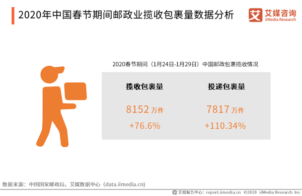2020年中國春節(jié)期間郵政業(yè)攬收包裹量數(shù)據(jù)分析 中國國家郵政局市場監(jiān)管司副司長侯延波1月30日透露,1月24日至29日,全國郵政業(yè)攬收包裹8125萬件,同比增長76.6%,投遞包裹7817萬件,同比增長110.34%,數(shù)據(jù)均高于往年水平。艾媒咨詢分析師認(rèn)為,受到疫情影響,不少商場、超市、電影院都選擇暫停或縮短營業(yè),但也有一些線上經(jīng)濟(jì)獲得意外增長。因?yàn)橐M量減少走出家門,不少人宅在家中網(wǎng)購,也讓快遞行業(yè)格外繁忙起來。