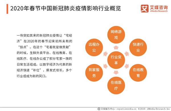 市場數(shù)據(jù)分析(節(jié)選): 2020年春節(jié)中國新冠肺炎疫情影響行業(yè)概覽 一場突如其來的新冠肺炎疫情讓“宅經(jīng)濟(jì)”在2020年的春節(jié)迎來前所未有的“拐點(diǎn)”。在這個(gè)“宅著就是做貢獻(xiàn)”的時(shí)候,生鮮外賣平臺、在線教育、在線醫(yī)療、在線辦公成了部分宅家一族的日常生活組成。以數(shù)字經(jīng)濟(jì)為代表的新經(jīng)濟(jì)快速“補(bǔ)位”,爆發(fā)式增長,多個(gè)行業(yè)或成為新的風(fēng)口。