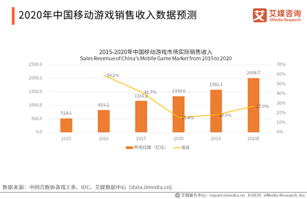 2020年中國移動游戲銷售收入數(shù)據(jù)預(yù)測 數(shù)據(jù)顯示,中國移動游戲體量直線攀登,到2019年移動游戲銷售收入觸底反彈,達(dá)到1581.1億元。艾媒咨詢分析師認(rèn)為,隨著手機(jī)滲透率的提高以及網(wǎng)絡(luò)技術(shù)的發(fā)展,手游逐漸成為人們娛樂生活的一部分,其市場規(guī)模會持續(xù)擴(kuò)大。受疫情影響“家里宅”的用戶中,移動用戶比例會更高,因而疫情會對移動游戲帶來短期利好的局面,預(yù)計(jì)2020年移動游戲的銷售收入將突破2000億元。