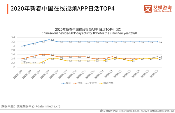 2020年新春中國在線視頻APP日活TOP4 數(shù)據(jù)顯示,2020年1月22日-2月6日期間,抖音、快手日活用戶規(guī)模均超過愛奇藝、騰訊視頻。大年初一當(dāng)天,抖音、快手日活達(dá)到峰值,分別是3.3億和2.6億。艾媒咨詢分析師認(rèn)為,新春期間短視頻平臺日活大于長視頻平臺,是因?yàn)槎桃曨l平臺更能滿足防疫居家的用戶創(chuàng)作需求和社交需求。