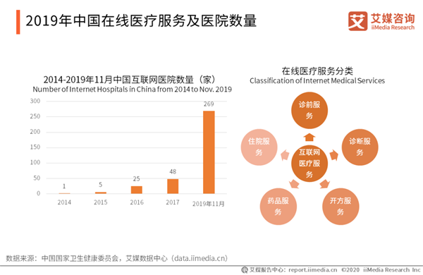 2019年中國在線醫(yī)療服務(wù)及醫(yī)院數(shù)量 截至2019年11月,中國的互聯(lián)網(wǎng)醫(yī)院數(shù)量已經(jīng)達(dá)到269家,而2018年3月這一數(shù)字僅為96。艾媒咨詢分析師認(rèn)為,疫情帶來了對于線上診療咨詢的大量需求,疫情發(fā)展的急迫性催動各級醫(yī)療在線平臺的建設(shè)進(jìn)程。未來公司與醫(yī)院的合作模式將轉(zhuǎn)化為深度合作共建模式,通過合作共建互聯(lián)網(wǎng)醫(yī)院,共同提供相關(guān)服務(wù),如診療費(fèi)、處方流轉(zhuǎn)、電子病歷管理等。