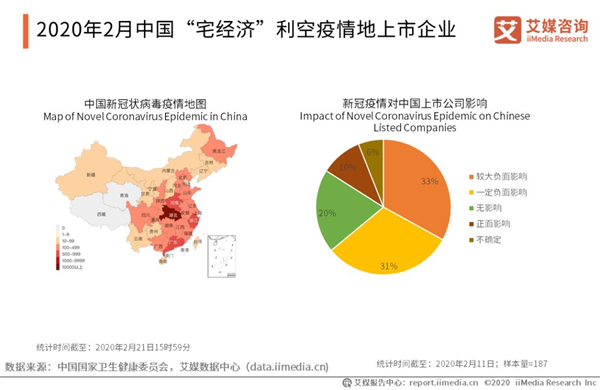 2020年2月中國“宅經(jīng)濟(jì)”利空疫情地上市企業(yè) 截至2020年2月11日,共有187家A股上市公司披露了新冠疫情對生產(chǎn)經(jīng)營活動的影響,其中湖北所受影響最大,有2家公司表示受到較大負(fù)面影響,10家表示受到一定負(fù)面影響;浙江、廣東分別有11家、9家公司表示受到一定負(fù)面影響。艾媒咨詢分析師認(rèn)為,疫情嚴(yán)重的地區(qū)復(fù)工時(shí)間推遲導(dǎo)致產(chǎn)能下降,而公司租金等成本仍在形成,給公司造成了損失。