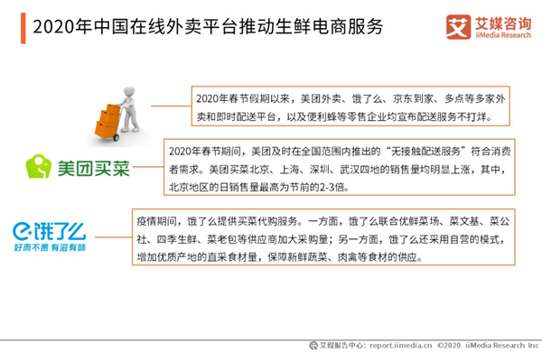 2020年中國在線外賣平臺推動生鮮電商服務(wù) 受到疫情影響,外賣平臺也成為消費(fèi)者購買生鮮果蔬的重要平臺。艾媒咨詢分析師認(rèn)為,2020年的新春疫情令即時(shí)配送行業(yè)再起波瀾,美團(tuán)、餓了么、京東等積極拓展在線買菜、無接觸配送等服務(wù)進(jìn)一步爭奪用戶,而多點(diǎn)、叮當(dāng)送菜、每日優(yōu)鮮等也趁機(jī)發(fā)力。但是隨著疫情消退,在線送菜業(yè)務(wù)未必會是剛需,那么如何保留當(dāng)前的用戶活躍度、提高用戶購買力是下一輪的競爭關(guān)鍵。