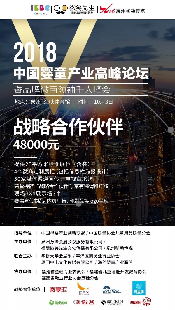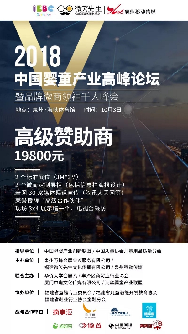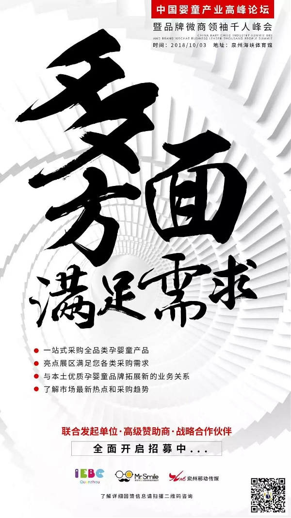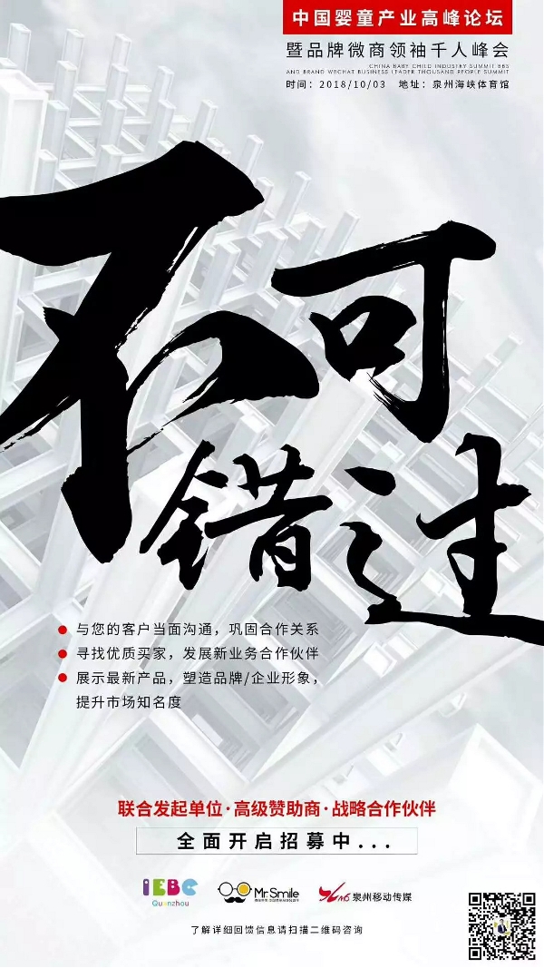 新趨勢、新常態(tài)、新嬰童的背景下,福建首屆中國嬰童產(chǎn)業(yè)高峰論壇暨品牌微商領(lǐng)袖千人峰會(huì)將于2018 年10 月3 日在泉州·海峽體育館隆重舉辦。