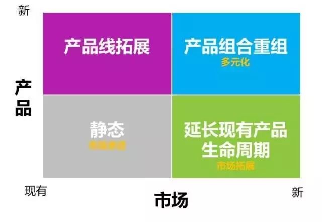 發(fā)展:特別適用于有發(fā)展前途的新產(chǎn)品的問號(hào)類產(chǎn)品以及明星類產(chǎn)品 維持:特別適用于大量現(xiàn)金支持的“金牛”類產(chǎn)品 收割:有些處境不佳的“金牛”類產(chǎn)品,前景暗淡,卻又需要從它身上獲得更多現(xiàn)金收入,往往采取這種方法 放棄:適用于沒有發(fā)展前途的瘦狗類和問號(hào)類產(chǎn)品 安索夫矩陣,則是將產(chǎn)品和市場(chǎng)作為兩個(gè)對(duì)比分析維度,來(lái)判斷產(chǎn)品組合在不同類型的市場(chǎng)的配置問題。通常產(chǎn)品組合管理都不能夠?qū)崿F(xiàn)全國(guó)一盤棋的理想狀態(tài),因此需結(jié)合不同的地理市場(chǎng)來(lái)管理。原本已在全國(guó)市場(chǎng)經(jīng)營(yíng)則需要設(shè)計(jì)全國(guó)必備產(chǎn)品及區(qū)域配置產(chǎn)品。