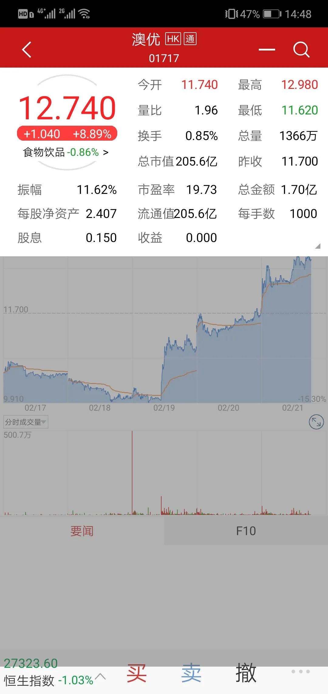 昨天,澳優總市值突破兩百億大關。據悉,澳優2月19日發布2019年正面盈利預告,自公告發出后,澳優股票連續三天大漲,今日總市值突破200億港元,截至發稿之時,澳優股價12.740港元/股,今日最高峰時已達12.980港元/股。