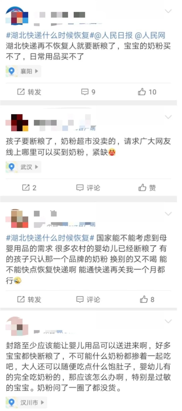“我的孩子沒有奶粉吃了” 自疫情爆發以來,湖北各市接連封城,不但阻止了人員流動,也阻擋車輛的流通,很多物流公司都無法進入,盡管多數奶粉企業的生產都足以保障市場供應,但物流“失靈”,貨物進出不便。進貨難、配送難成為當地母嬰門店的常態,部分門店奶粉庫存僅夠維持一個星期。 湖北武漢、孝感等多地的奶粉一罐難求,每一罐都來之不易。由于疫情影響,湖北宜昌市興山縣灘坪村還在封路,村民家里1歲多的孩子已經多天沒有奶粉喝,此前預定好的奶粉在縣里也無法拿回家,無奈之下向消防求助。消防員驅車30公里去縣城取奶粉,村干部在村口接力,才將奶粉順利送到村民手中。 其實像這樣,奶粉緊缺的事情還有很多,在微博上輸入“奶粉斷糧”、“寶寶斷糧”等關鍵詞,立即會搜出大量口糧告急的吶喊,“求助奶粉、請求通物流買奶粉”等很多相關內容比比皆是,同時當地的很多母嬰店主同樣也在為奶粉發愁。可見,解決嬰幼兒口糧售賣及配送問題已經迫在眉睫。