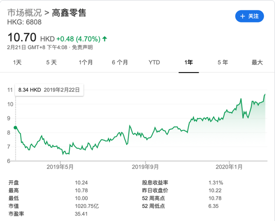 2019年,高鑫零售同店銷售增長為-1.01%,主要是歐尚與大潤發(fā)的整合造成了拖累。而高鑫零售CEO黃明端透露,大潤發(fā)門店的同店銷售增長為正的0.5%。 據(jù)凱度消費者指數(shù)報告,到2019年12月,高鑫零售集團的市場份額為8.3%,位列第一。 過去的這一年,零售商超的日子不好過。家樂福、麥德龍從中國撤退,沃爾瑪大幅關(guān)店。大潤發(fā)還能保持同店銷售正增長,與飛速發(fā)展的線上業(yè)務(wù)有很大關(guān)系——2019年,高鑫集團O2O業(yè)務(wù)總銷售營收同比增長90%,“生鮮一小時達”的用戶數(shù)突破3300萬,日均單量達到每店640單。 黃明端表示,經(jīng)過幾年的發(fā)展,高鑫零售已從新零售的參與者轉(zhuǎn)變?yōu)轭I(lǐng)跑者。基于與阿里巴巴的緊密合作,打破了實體店原有的瓶頸,O2O業(yè)務(wù)的盈利模式已初具雛形。 這份“超出預(yù)期”的財報發(fā)布后,2月21日,高鑫零售股價上漲4.7%至10.7港元/股,為近一年來最高點。