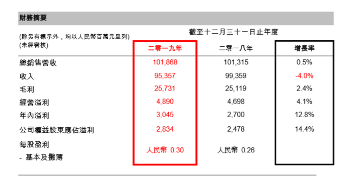 2月20日,大潤發(fā)母公司高鑫零售發(fā)布2019年全年財報。總銷售收入1018.68億元,同比增長0.5%,歸母凈利潤28.34億元,同比增長14.4%。