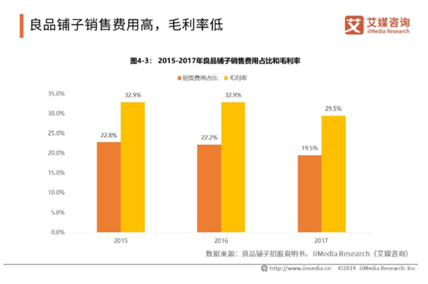 在這期間,休閑食品電商三巨頭的其他兩位,被好想你收購的百草味,作為“中國零食電商并購第一例”進軍資本市場;2012年成立三只松鼠,去年7月在深交所掛牌上市,被譽為“互聯(lián)網(wǎng)休閑零食第一股”。 另外,在競爭的賽道上,跑在前面的還有來伊份和鹽津鋪子。至此,在中國零食電商市場上屢屢被提及的“3+2”組合,才終于在資本市場上完成集合。 不過,良品鋪子的表現(xiàn)有些不如人意。此前,在招股書發(fā)布以后,不少人對良品鋪子業(yè)績表現(xiàn)不甚樂觀。 最核心的問題來自于良品鋪子的利潤表現(xiàn)。雖然營業(yè)收入逐年上升,但毛利率卻呈現(xiàn)下滑趨勢。招股說明書顯示,2015年、2016年、2017年及2018年上半年,分別實現(xiàn)營收31.49億元、42.89億元、54.24億元、30.35億元;毛利率分別為32.93%、32.88%、29.52%、29.75%。在扣除銷售、管理和研發(fā)費用之后,經(jīng)營利潤率可能就下降到了10%以下的水平。