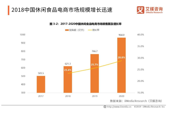 從收購方百事來看,這倒是一個合算的買賣。此次百事收購百草味,旨在加強線上銷售能力。一直以來,線下渠道強勢,線上渠道還欠火候。 無論是百草味所擅長的線上銷售渠道和新營銷模式,還是占據(jù)優(yōu)勢的堅果炒貨、烘焙糕點等品類,對百事的吸引力都毋庸置疑。而百事的線下渠道能力,對現(xiàn)在重新開始征戰(zhàn)線下的百草味來說,也相當(dāng)有吸引力。 群雄并起也意味著休閑食品電商的競爭開始進入下半場,在資本助力下,與此前相比,這一輪的角逐注定將更激烈,也更慘烈。艾媒咨詢數(shù)據(jù)顯示,2018年中國休閑食品電商市場銷售額為621.3億元,同比增速達到23.4%。未來市場規(guī)模將進一步擴大,預(yù)計到2020年其市場銷售額將突破900億元。