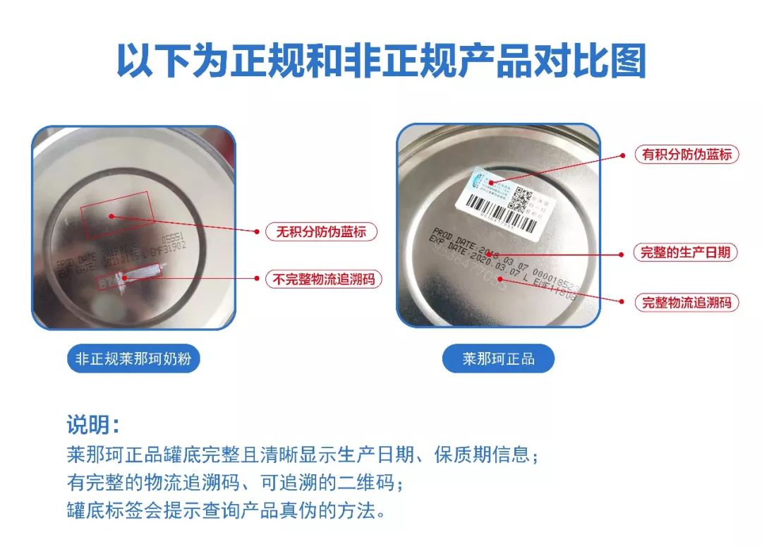 另外,萊那珂嬰幼兒奶粉均可通過罐底追溯碼和防偽碼查驗真?zhèn)危魏喂未a的產品均為非正規(guī)產品。