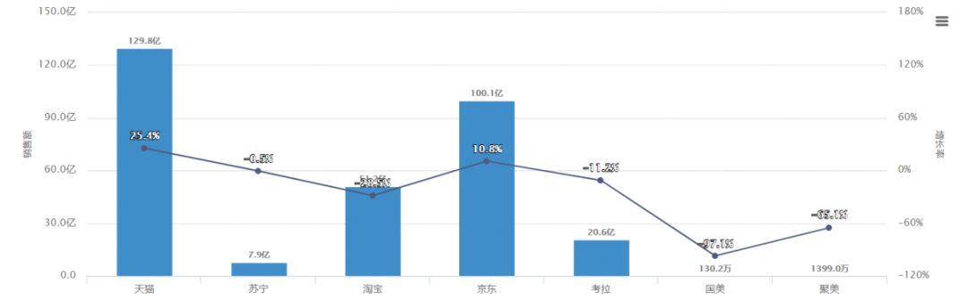 從渠道角度來(lái)講,京東和天貓一直是嬰兒食品的最大線上平臺(tái),同時(shí)2019年,也僅有這兩大平臺(tái)在保持增長(zhǎng)。其中嬰兒食品的最大份額來(lái)自天貓,占到41.9%,同比增速達(dá)25.4%;其次才是京東,天貓的嬰兒食品規(guī)模是第二大平臺(tái)京東的1.3倍;其余淘寶、考拉、蘇寧、國(guó)美、聚美等平臺(tái)都在不同程度地下滑。