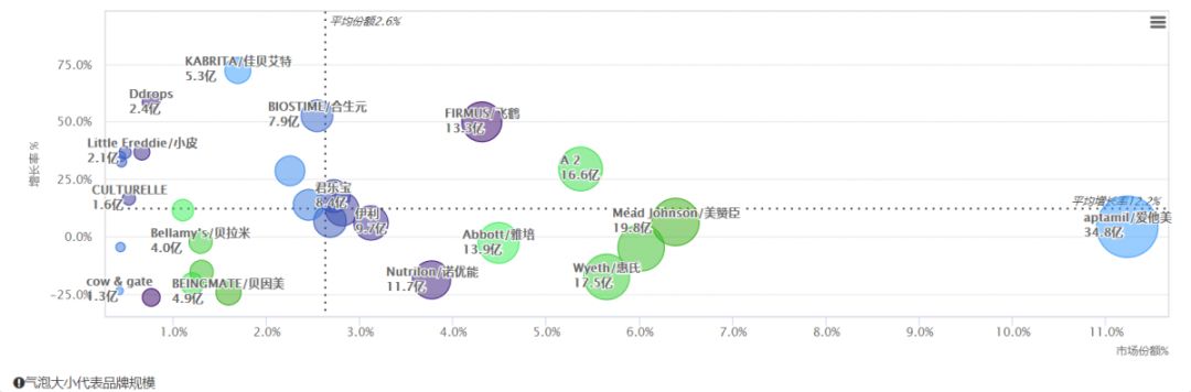 但與2018年相比,top10 品牌中,增速下滑的品牌增多,其中美素佳兒、惠氏、雅培、諾優(yōu)能的銷售增速都呈現(xiàn)了負(fù)增長(zhǎng)。能值得注意的是,top10品牌中,國(guó)產(chǎn)品牌飛鶴在高速增長(zhǎng),增長(zhǎng)率最高,達(dá)49.9%,另外專注于A2蛋白的a2奶粉持續(xù)增長(zhǎng),增速達(dá)29.4%。 從整個(gè)嬰兒食品市場(chǎng)來(lái)看,KABRITA/佳貝艾特增長(zhǎng)最快,增速達(dá)72.3%,其次則是合生元,增速達(dá)52.5%。其它品類中,營(yíng)養(yǎng)品品牌Ddrops增速最快,達(dá)58.4%,另一品牌童年時(shí)光增速也趨近30%;另外輔零食品牌小皮、禧貝、英氏等品牌都保持高速增長(zhǎng),增速都保持在30%以上,可見(jiàn),嬰兒輔食近年來(lái)的發(fā)展也是一片大好,基于認(rèn)知的提升,輔食品類會(huì)快速增長(zhǎng),使用周期也將會(huì)有所延長(zhǎng)。