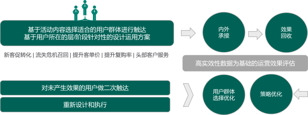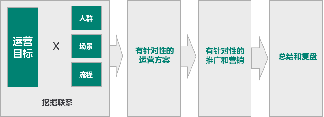 在了解了精細(xì)化運營的內(nèi)容后,我們進(jìn)一步了解其實施步驟: 挖掘“運營目標(biāo)”與“人群”、“場景”、“流程”間的聯(lián)系,從而形成有針對性的運營思路及營銷手段,在方案實施一段時間后進(jìn)行總結(jié)復(fù)盤,回看目標(biāo)達(dá)成度。