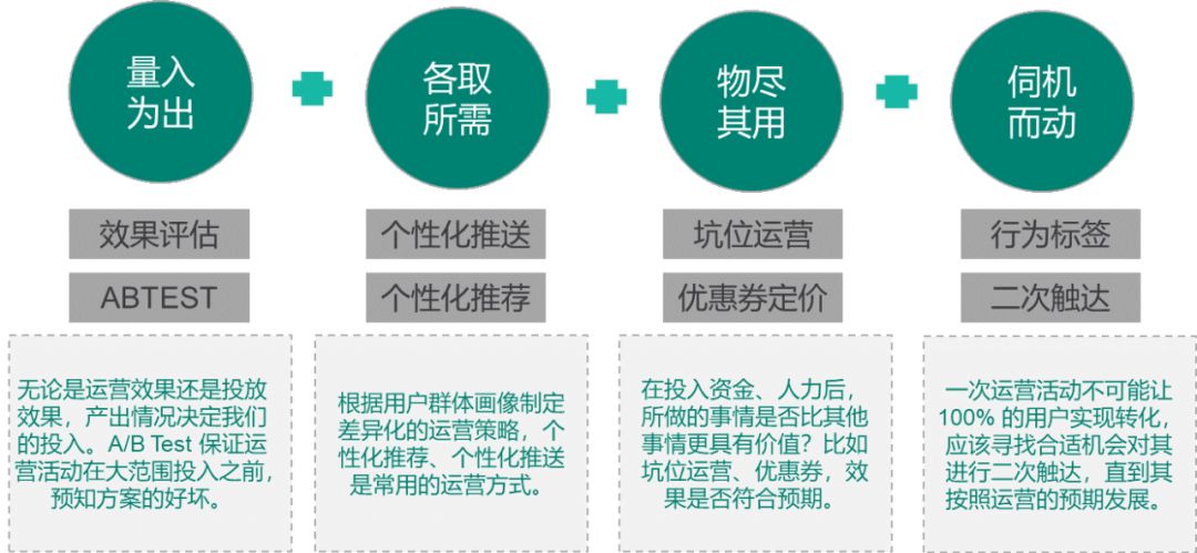 四:精細(xì)化運營越“精”越好 我們經(jīng)常提到精細(xì)化運營,那么什么才是精細(xì)化運營?精細(xì)化運營實施分幾個步驟? 四組關(guān)鍵詞定義精細(xì)化運營:【量入為出】— 以效果評估為核心、【各取所需】— 以客戶的個性化推送及推薦為核心、【物盡其用】— 以資金及人力價值合理運用為核心、【伺機(jī)而動】— 基于未達(dá)成目標(biāo)情況下,進(jìn)行二次觸達(dá)。