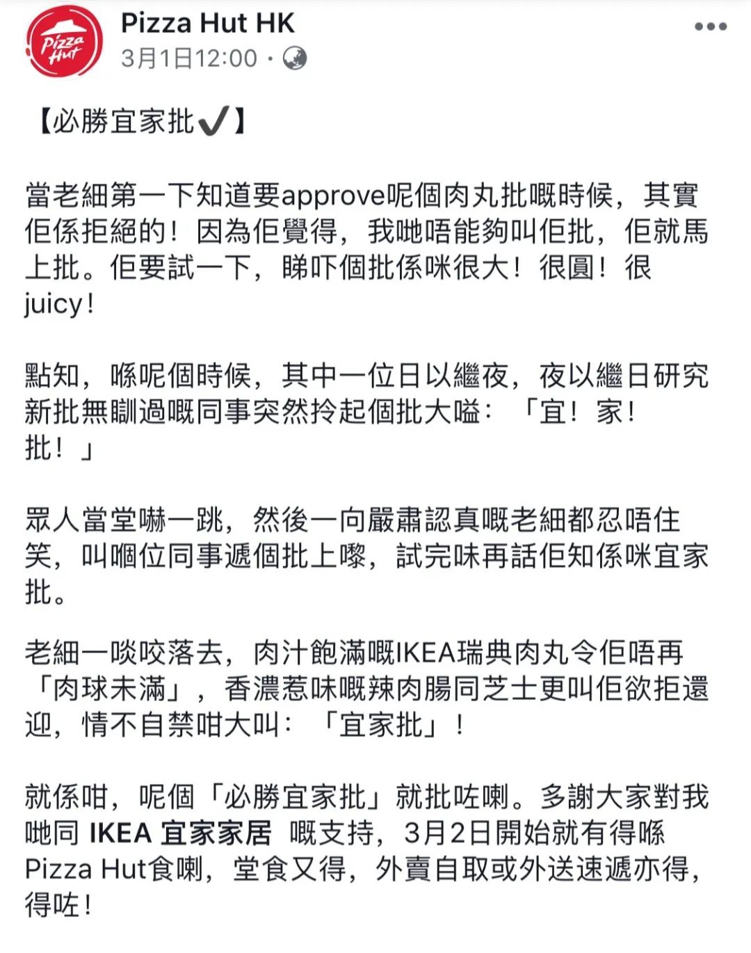 必勝客還在Facebook上與大家分享了這款披薩背后的趣味小故事,因?yàn)樵诨浾Z中,“宜家”的發(fā)音和“現(xiàn)在”很像,所以“現(xiàn)在派”就變成了“宜家派”,于是肉丸披薩就這樣誕生了