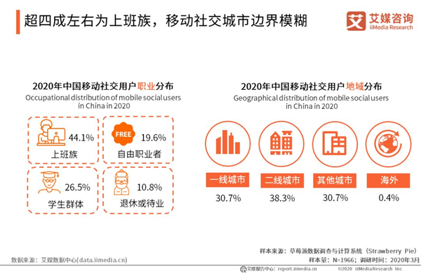 超四成左右為上班族,移動社交城市邊界模糊 iiMedia Research(艾媒咨詢)調研數據顯示,超四成的受訪用戶為上班族,具有較為穩定的工作,緊隨其后的分別是學生及自由職業者群體。在地域分布上,各線城市覆蓋用戶較均衡,也有個別為海外用戶,這在一定程度反映出移動社交的邊界不再明顯,隨著移動互聯網及設備的發展及社交需求的推動,移動社交已滲透到下線城市,并構成社會基礎的重要部分。