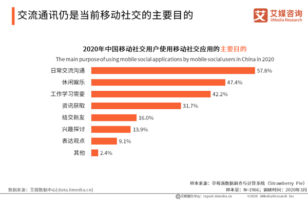 交流通訊仍是當前移動社交的主要目的 iiMedia Research(艾媒咨詢)調研數據顯示,六成以上受訪用戶通過移動社交應用以實現日常交流,此外,有四成以上的受訪用戶基于休閑娛樂和工作學習的需求使用移動社交應用。艾媒咨詢分析師認為,交流通訊依然是當前移動社交應用的主要使用目的,與此同時,也有越來越多的用戶主動尋求娛樂化的社交模式。