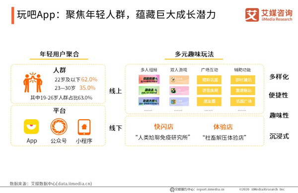 行業動態:社交游戲化,場景化娛樂形式火熱 伴隨移動社交用戶的迭代,以95、00后為主的年輕新世代成為中國移動社交市場的主力軍。這部分年輕用戶更青睞于輕松、趣味社交形式,移動社交廠商也開始尋求泛娛樂類的社交產品,其中包括玩吧App 、我是謎App等多款泛娛樂類社交產品。如今娛樂游戲與社交更深度融合,除游戲社交化以外,社交也呈現出游戲化的趨勢。艾媒咨詢分析師認為,社交游戲化,推動社交場景娛樂化,通過小游戲、語音互動等方式為用戶創造豐富和封閉的娛樂場景,釋放社交壓力的同時增加趣味性和沉浸感,更契合當下95、00后的新型社交需求。
