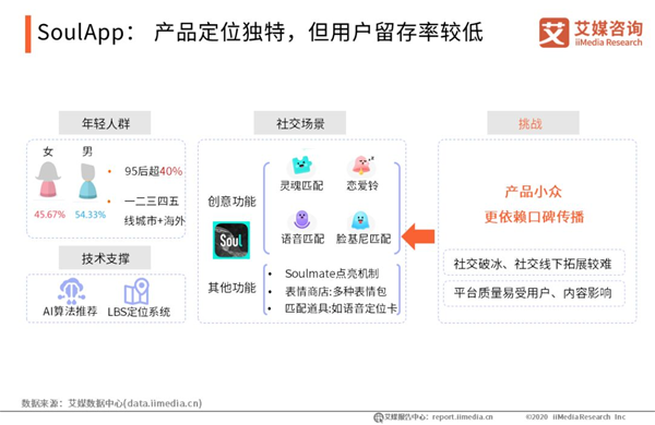 SoulApp:產品定位獨特,但用戶留存率較低 發布于2015年的SoulApp,是一款專門針對年輕人社交,通過AI算法匹配用戶的陌生人社交軟件。Soul定位獨特,Slogan“跟隨靈魂找到你”專注于年輕人“孤獨”的痛點,借助AI算法實現“靈魂測試”,這也成為Soul較為突出的產品特色。但陌生人社交應用普遍缺乏有效的溝通推進方法,在社交破冰,社交線下拓展等方面都對產品提出了更高的要求。此外,陌生人社交平臺的質量還容易受到用戶、內容的影響,平臺后續發展仍面臨重重考驗。