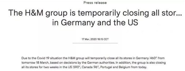 值得一提的還有,公司過去一周已經關閉了波蘭、西班牙、捷克、保加利亞、比利時、法國、奧地利、盧森堡、哈薩克斯坦、瑞士、希臘、斯洛維尼亞、立陶宛、秘魯、烏克蘭、菲律賓、馬來西亞以及塞浦路斯的所有門店。但H&M在中國的業務卻逐漸復蘇,目前516家分店中的500家已經恢復營業。 而Gap預計受疫情影響,2020年第一財季銷售額將損失約1億美元。同時表示,Gap今年將在全球范圍內關閉約170家品牌門店。 同一日,德國運動品牌巨頭阿迪達斯也宣布,將暫時關閉歐洲和北美的全部直營門店。根據計劃,歐洲門店將于3月18日至29日關閉,美國和加拿大門店將于3月17日至29日關閉。 此外,日本服飾品牌優衣庫的運營公司迅銷集團也于3月17日宣布,由于疫情擴大,本日起,美國境內的全部50家門店均暫停營業。