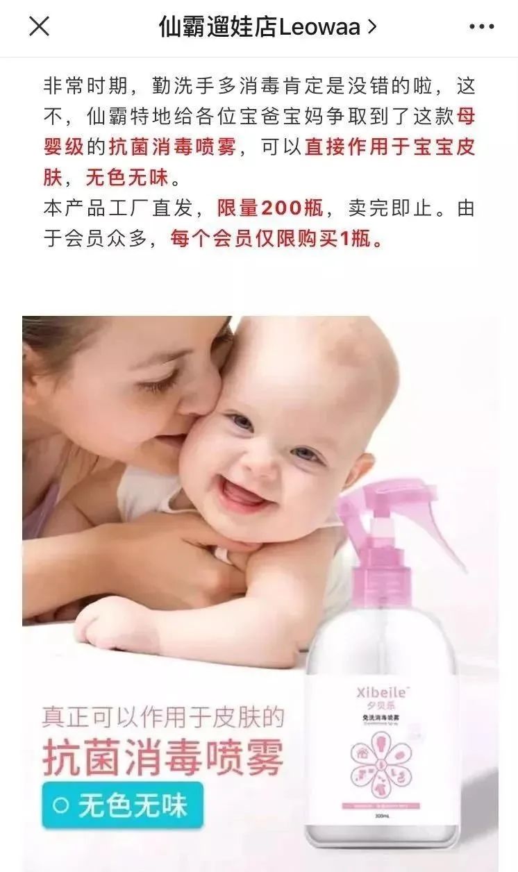 仙霸公司還通過與早教中心等機(jī)構(gòu)線下異業(yè)結(jié)盟,進(jìn)行玩具銷售合作。這些機(jī)構(gòu)疫情期間同樣無法營業(yè),通過向自身會員群推薦仙霸玩具套餐,售出后可得傭金。 此外,仙霸在這個消毒產(chǎn)品成為剛需的特殊時期,快速整合供應(yīng)鏈資源,延展剛需產(chǎn)品銷售,推出“母嬰級”消毒產(chǎn)品,短時間內(nèi)即被搶購一空。