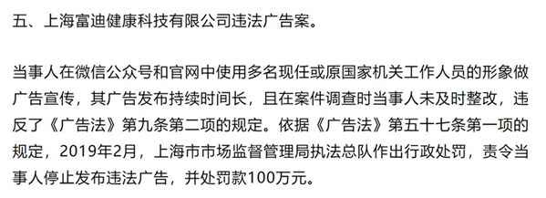 ⊙ 違法案例4-富迪健康:使用國家機關工作人員形象 2019年,上海富迪健康科技有限公司因使用多名國家機關工作人員的形象做廣告宣傳,被罰款100萬元。