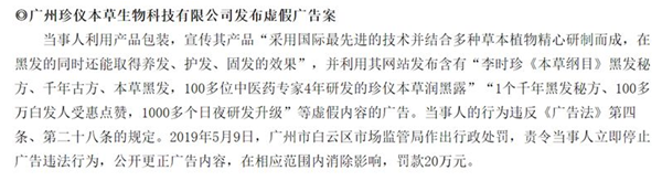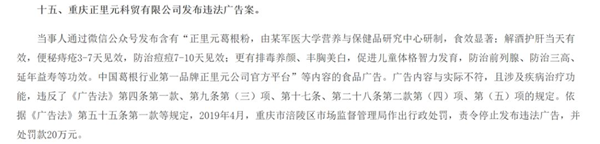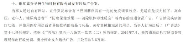 ⊙ 違法案例25-圣洲生物科技:普通食品虛構治療功能被罰 2019年,浙江嘉興圣洲生物科技有限公司因發布涉及疾病治療功能、使用醫療用語的普通食品廣告“巴西蘑菇”,被罰款7.5萬元。